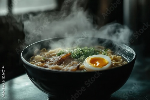 traditional japanese ramen bowl with rich miso broth, tender pork belly, soft-boiled egg, nori, and green onions, steam rising dramatically in moody lighting