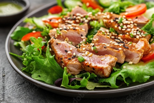 Traditional Japanese salad featuring medium rare Ahi tuna sesame and fresh vegetables on a plate Genuine Japanese cuisine