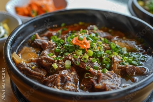 Traditional Korean cuisine including beef dishes soups and side dishes like salted squid and kimchi