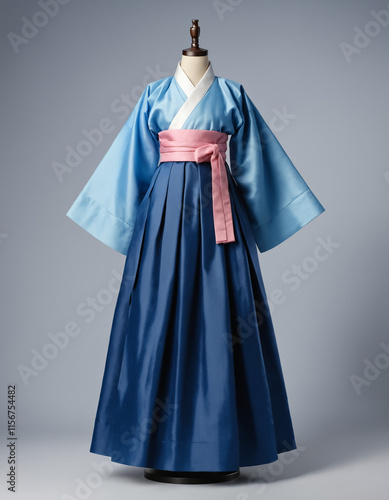 Traditional korean light blue hanbok showcased on a mannequin, isolated on a gray wall background, Ai generated images