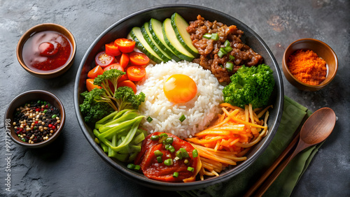 Traditional Korean mixed rice dish with an assortment of vegetables, proteins, and spicy gochujang sauce
