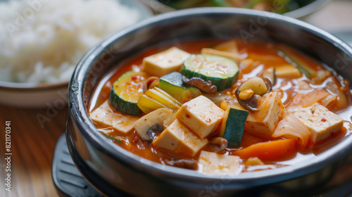 Traditional korean soft tofu stew with zucchini and mushrooms, served with hot rice in a spicy broth