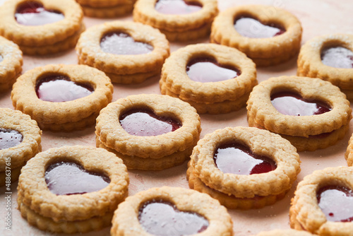 Traditional Linzer cookie with strawberry jam and powder sugar on pink beautiful background. Top view. Traditional homemade Austrian sweet dessert food on Valentines Day. Holiday snack concept.