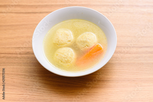 Traditional matzoh ball (kneidlach) soup.White bowl with authentic matzo ball chicken taste hot soup ( bouillon ) tradition Jewish food for Passover and every day.