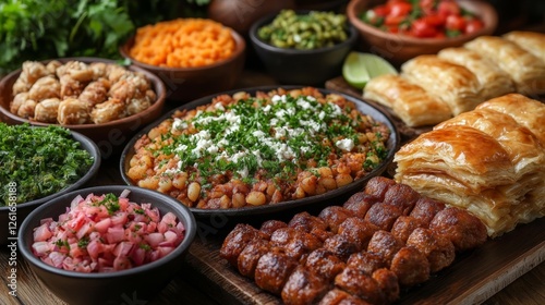 Traditional Middle Eastern Cuisine with Grilled Meat and Side Dishes. Generative AI