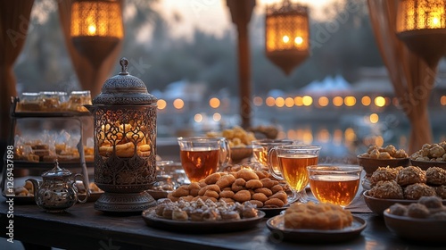 Traditional Middle Eastern sweets and tea served at a festive gathering with warm lighting