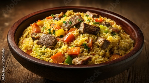 Traditional Moroccan couscous with vegetables and lamb. Featuring a savory and fragrant dish. Highlighting the texture and flavors of the couscous. Ideal for food and cultural themes.