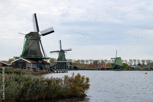 Traditional Old Green Windmills along the Zaan River in Zaanse Schans Netherlands