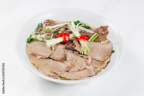 Traditional oriental cuisine of Vietnam. Pho bo soup with rice noodles, beef, pepper, wheat germ, greens