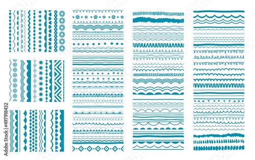 Traditional ornaments, seasonal patterns collection. Border, divider, hand drawn vector brush, stroke, line art set. Green blue decorative design elements for greeting decoration, card template.