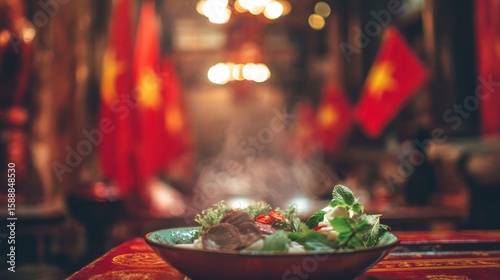 Traditional pho with fresh herbs and chili is artfully arranged on a lacquered tray, steam rising against red flags.