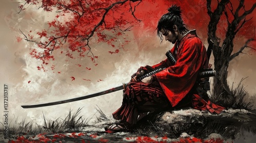 Traditional portrait of a Japanese samurai with his blade.