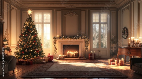 Traditional Portuguese living room adorned with festive Christmas decorations including a beautifully lit tree and a cozy fireplace setting