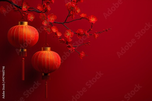 Traditional red Chinese lanterns and plum blossom branch on red background for Lunar New Year decor
