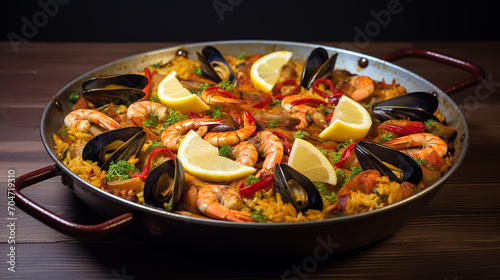 traditional seafood paella in the pan