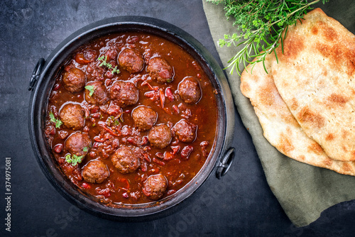 Traditional slow cooked American Tex-Mex meatballs chili with mincemeat and beans in a spicy sauce offered with pita bread as top view in a design cast-iron roasting dish with copy space
