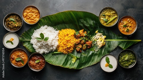 Traditional South Indian meal served on a fresh banana leaf, featuring a variety of colorful dishes, rice, and accompaniments