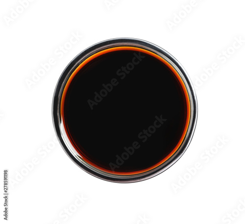 Traditional soy sauce in bowl on white background, top view