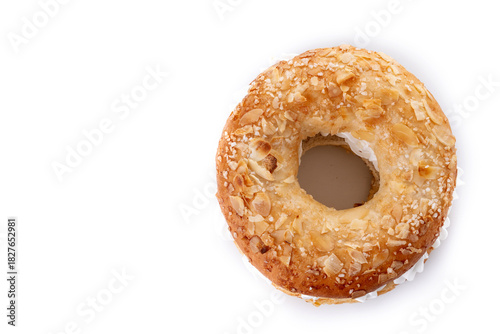 Traditional Spanish Roscon de Reyes isolated on white background. Top view. Copy space