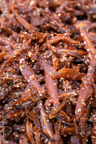 traditional spicy dried small fish in the market.spicy silver anchovy.