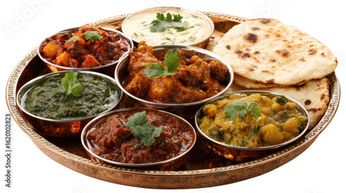 Traditional thali plate with assorted Indian curries spinach dish chickpea curry chicken curry naan bread and yogurt sauce garnished with fresh cilantro vibrant and appetizing