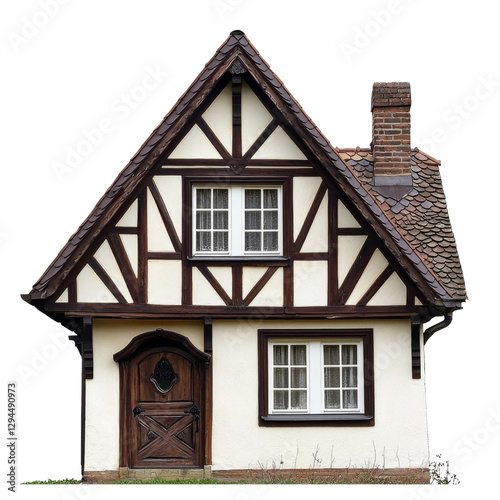 Traditional timber framed house with steep roof and chimney, featuring white walls and wooden accents. charming architectural style that evokes cozy atmosphere