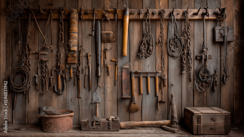 Traditional tools hanging neatly on a wooden wall, workshop, photo style