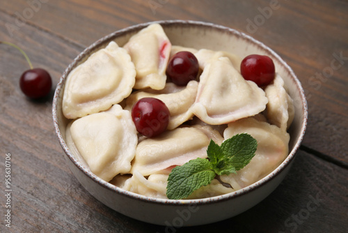 Traditional Ukrainian dumplings (varenyky) with cherries on wooden table, closeup