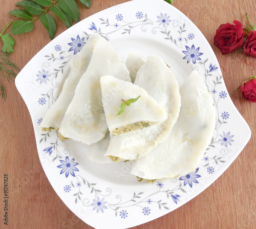 Traditional vegetarian dish made from rice flour dough with spicy filling.