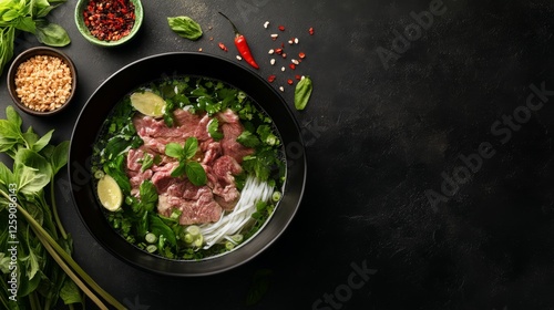 Traditional Vietnamese pho with beef and herbs. Featuring a fragrant and flavorful dish. Highlighting the texture and flavors of the pho. Ideal for food and cultural themes.