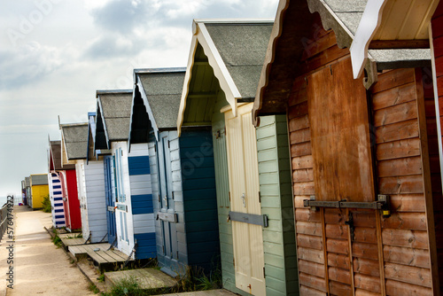 Traditional wooden beach huts on the promenade in the seaside town of Cromer