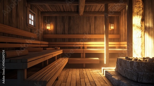 Traditional wooden Scandinavian sauna interior with tiered benches, wooden walls, and a stone heater glowing with warm light