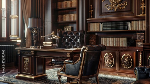 Traditional workplace interiors exude timeless elegance with classic furnishings, rich wood tones, and ornate details like leather chairs, decorative desks, and intricate moldings.