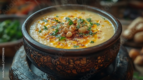 Traditional-style creamy soup with a golden glow and warm spices in a rustic setting