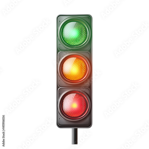 Traffic light with green light on top, yellow in middle, red at bottom isolated on transparent background