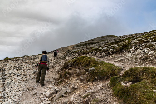 Trail, Rocks and vegetation at Croagh Patrick mountain with Westport in background