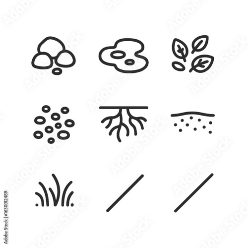 Trail Terrain Icons. Outline icon set of trail terrain types: rocky surface, muddy puddle, forest leaf litter, gravel stretch,