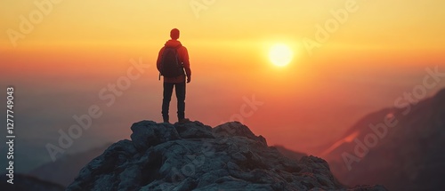 Trailblazer standing on a rocky summit, looking at the vast horizon as the sun rises, metaphor for ambition and limitless potential, breathtaking realism, 8K