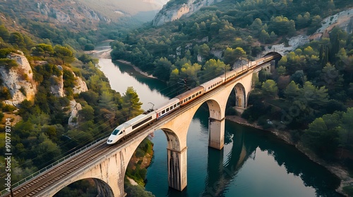 Train Crossing a Stone Arch Bridge over a River Gorge