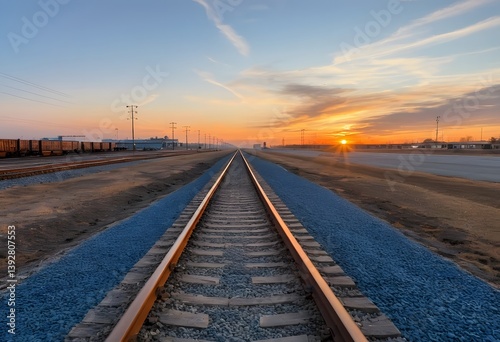 Train Tracks Stretch Toward The Horizon. Golden Sunrise Illuminates The Sky. Peaceful Morning Scene. Airport Nearby, Promising Journeys Begin. A Fresh Start.