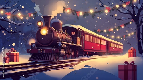 Train with garlands and gifts, bringing joy in winter