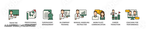Training icon infographic illustration concept with icon of coaching, teaching, knowledge, development, learning, experience, and skills icon live stroke and easy to edit