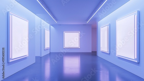 Tranquil art gallery with white frames and blue lighting.