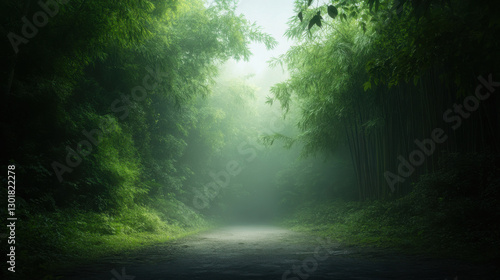 Tranquil bamboo grove with mist rising in morning light, creating serene atmosphere.