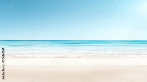 Tranquil beach scene with clear blue skies and gentle ocean waves lapping on pristine white sand.