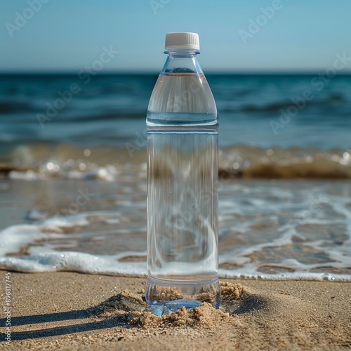 Tranquil Beach Scene with Clear Water Bottle - Minimalist Summer Concept with Copy Space for Text