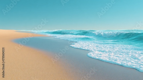 Tranquil beach scene with gentle waves lapping at the shore under a clear blue sky, evoking a sense of peace and relaxation.