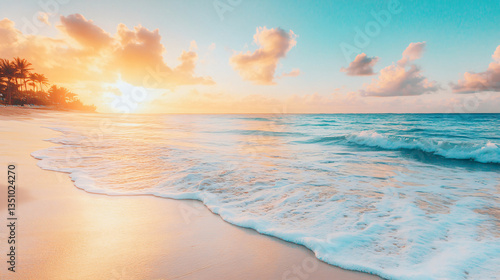 Tranquil beach scene with waves gently crashing on the shore under warm hues from a cozy sunset creating a serene natural environment.