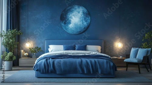 Tranquil Bedroom with Moon Phase Headboard Subtle Lighting and a Relaxing Celestial Ambiance