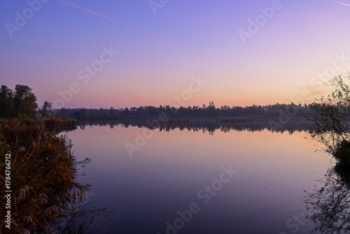 Tranquil Blue Hour: Purple Dawn Sky Reflected on Still Biesbosch Wetland Water